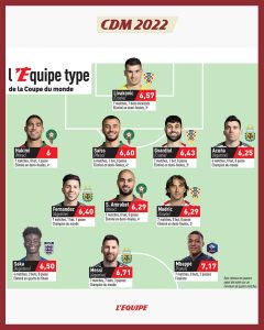 الهجوم: كيليان مبابي (فرنسا- 7.17) – ليونيل ميسي (الأرجنتين- 6.71) – بوكايو ساكا (إنكلترا- 6.50).